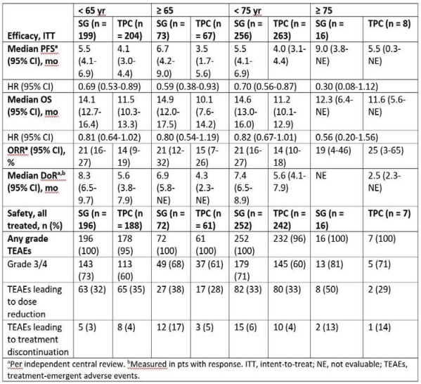 耿翠芝教授:TROPiCS-02研究中,SG组有73例(27%)患者≥65岁,16例(6%)≥75岁;TPC组则分别有67例(25%)和8例(3%)。总体上来说,无论是<65岁或≥65岁,无论是<75岁或≥75岁,SG治疗组均相较于TPC组均有PFS和OS的获益,其安全性表现也是一致的。在<65岁和≥65岁亚组中,SG组和TPC组的3/4级TEAE分别为73%和60%、68%和61%;在<75岁和≥75岁亚组中,SG组和TPC组的3/4级TEAE分别为71%和60%、81%和71%。
