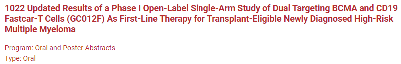 编者按:在2023第65届美国血液学年会(ASH)上,上海长征医院杜鹃教授团队的一项I期研究(abstract 1022)初步评估了BCMA/CD19双靶点FasT CAR-T细胞(GC012F)治疗HR-NDMM患者的疗效及安全性,入选了大会口头发言。为此,《肿瘤瞭望》特整理该摘要内容并邀请杜鹃教授进行点评解读,以供读者参考。