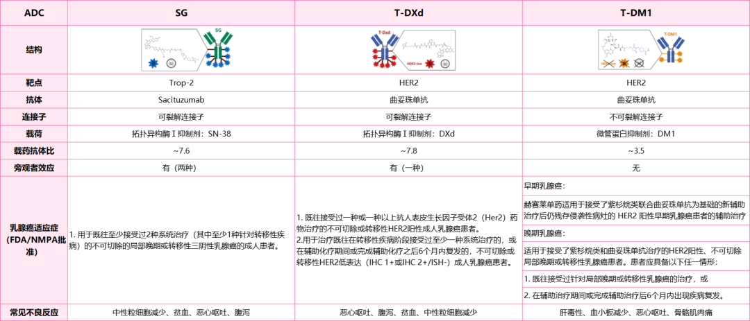 目前在乳腺癌领域,美国FDA和我国均批准了戈沙妥珠单抗(Sacituzumab govitecan,SG)、德曲妥珠单抗(Trastuzumab Deruxtecan,T-DXd)、和恩美曲妥珠单抗(Trastuzumab emtansine,T-DM1)三种ADC。由于靶点及结构的不同,三者获批的适应症以及不良反应谱也不完全一致。在全球范围,SG目前主要用于二线及以上治疗晚期三阴性乳腺癌(TNBC);T-DXd则主要针对HER2阳性、HER2低表达晚期乳腺癌的二线及以上治疗;T-DM1则用于早期HER2阳性乳腺癌的强化辅助治疗或晚期HER2阳性乳腺癌的二线及其后治疗。