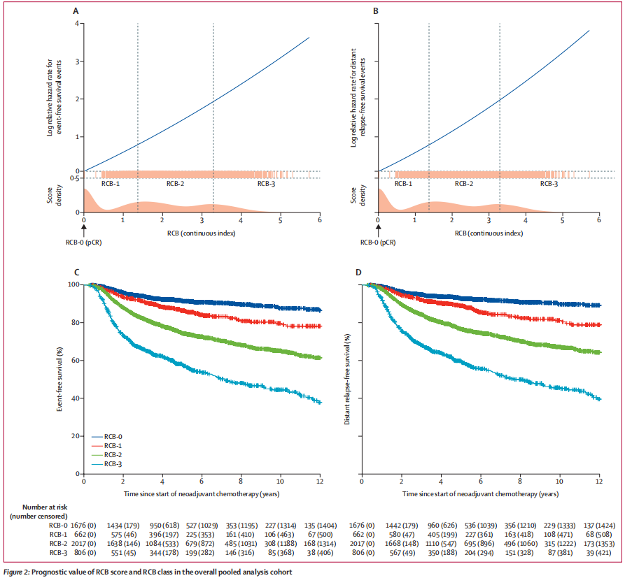 在这项汇总分析中,通过与现场调查人员的沟通,确定了欧洲和美国12个研究所和相关临床试验(4项随机对照试验、8项队列研究),其中包括1994年9月12日至2019年2月11日接受新辅助化疗的5161名患者的数据。2019年11月,我们从接受新辅助化疗和手术治疗的原发性Ⅰ~Ⅲ期乳腺癌患者(18岁)中获得了参与者的RCB结果、临床和病理分期、肿瘤亚型和分级、治疗和随访数据。研究者使用混合效应Cox模型,结合随机RCB和队列效应,评估了连续RCB评分与主要研究结局(无事件生存率)之间的相关性,以解释研究之间的异质性,并分层以解释激素受体状态和HER2状态定义的不同癌症亚型的基线风险差异。