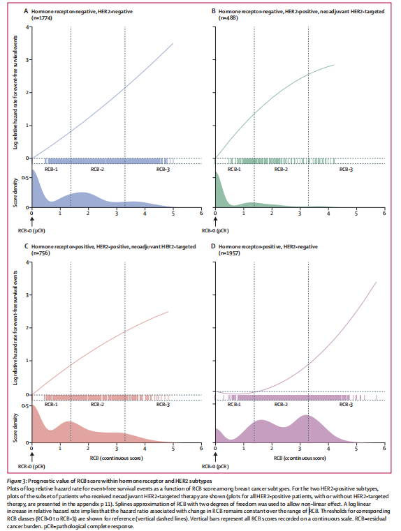 RCB每增加一个单位,相关的单变量复发/死亡危险比(HR)均有增加:HR+/HER2-患者增加1.55倍(95%CI:1.41~1.71);HR-/HER2+患者增加2.16倍(95%CI:1.79~2.61)(无论有无HER2靶向治疗;所有亚型P<0.0001)。