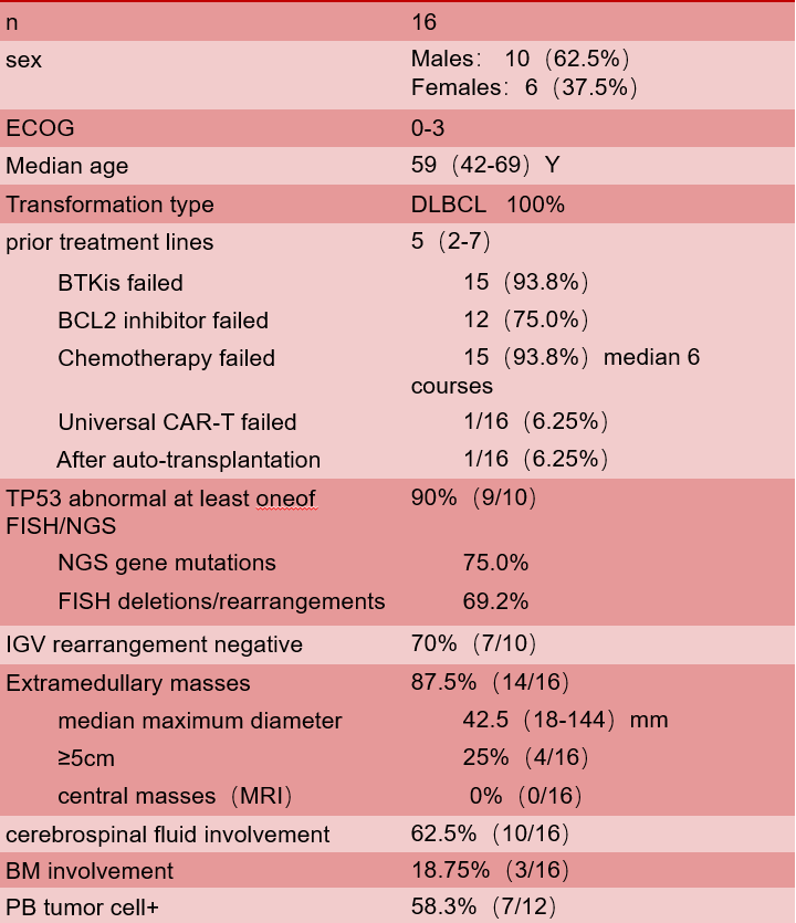 结果:在2020年2月1日至2023年2月28日期间,本中心对16例诊断为RT的患者进行了CAR-T细胞治疗,这些患者均发展为弥漫性大B细胞淋巴瘤。患者中位年龄为59岁(范围:42~69岁),男性占62.5%(10/16),女性占37.5%(6/16)。美国东部肿瘤协作组(ECOG)评分为0~3分。中位既往治疗线数为5线(2~7)。既往BTKis治疗失败的占93.8%,BCL2抑制剂治疗失败的占75%;93.8%接受过化疗(中位6个疗程)。1例患者先前通用型CAR-T细胞治疗失败,另1例患者在自体移植后复发。90%的患者通过FISH或二代基因测序检测到至少一种TP53异常。87.5%(14/16)的患者发现髓外肿块,中位最大直径为42.5 mm(18~144mm)。肿块>5 cm者占25%(4/16),骨髓受累者占62.5%(10/16),脑脊液受累者占18.75%(3/16)。所有患者的MRI检查均未发现中枢肿块。