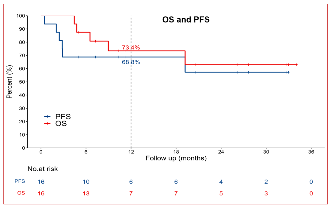 3个月的完全缓解(CR)率为56.3%(9/16),总缓解率(ORR)为68.8%(11/16)。截至2023年7月6日,中位随访时间为10.6个月(4.4~33.6个月),1年OS率为73.4%,1年PFS率为68.8%。中位OS和PFS均未达到。