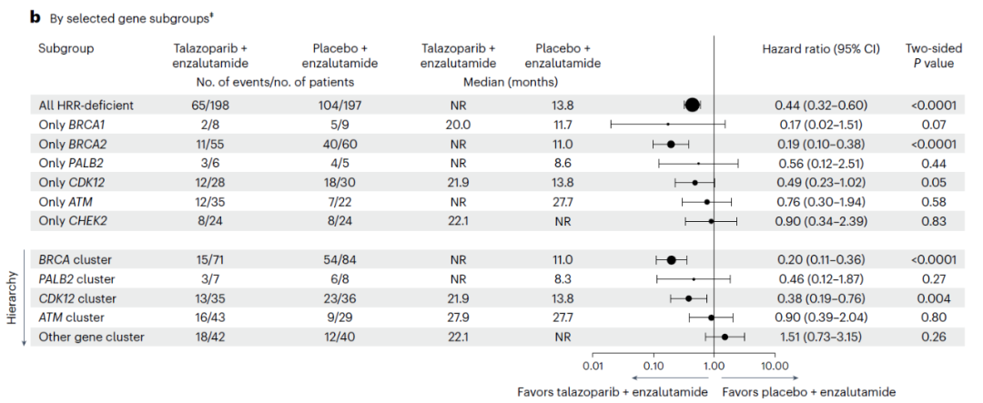 在BRCA1/BRCA2亚组中,他拉唑帕利联合恩扎卢胺使疾病进展或死亡的风险降低了80%,在非BRCA1/BRCA2亚组中降低了32%。有限的临床数据表明,在CDK12突变的前列腺癌患者中,PARP抑制剂单药疗法的预后不良,受益最小。CDK12突变与独特的染色体损伤标记和复制转录中断相关,可能导致易受恩扎卢胺和他拉唑帕利联合用药的影响。尽管患者人数较少,但在BRCA1单基因亚组与BRCA2相似的获益也很明显,而在PALB2亚组中,获益较小。