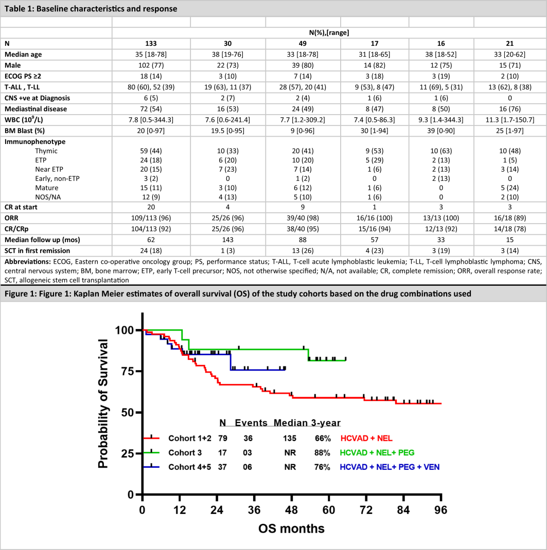 主要结果:5个研究队列共纳入133例患者(队列1=30,2=49,3=17,4=16,5=21)(表1)。80例患者(60%)患有T-ALL,52例患者(39%)患有T-LBL,1例患者患有ETP/髓样双表型白血病。整个队列的中位年龄为35岁(18~78岁),102例患者(77%)为男性,83例患者(62%)为白人,18例患者(14%)体力状况评分(PS)≥2分。在中位随访62个月时,中位总生存期(OS)尚未达到(NR),3年OS率为71%,5年OS率为64%。接受HCVAD+NEL(队列1+2)、HCVAD+NEL+PEG(队列3)和HCVAD+NEL+PEG+VEN(队列4+5)治疗的患者3年OS率分别为66%、88%和76%(图1)。两个VEN队列的中位OS均未达到,队列4的3年OS率为72%,队列5为88%(P=0.51),但后者的随访时间明显较短(33 vs.15个月)。