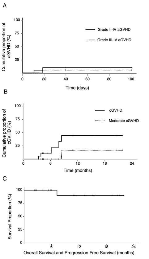 第一阶段共纳入11例患者(DL1有5例,DL2有3例,DL3有3例),无患者发生III-IV级aGvHD。在此基础上,选择DL3作为II期PTCy剂量,共18例患者。共纳入29例患者(女17例,男12例),中位年龄39岁(17-65岁),中位随访时间12.7个月(2.2-22.1个月)。患者和疾病特征见表1。移植后第30天,所有患者均达到完全缓解(CR)和微小残留病(MRD)清除。移植后100天内无一例患者发生III-IV级aGVHD。