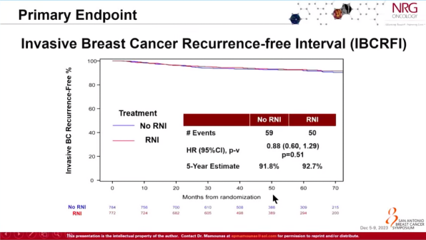 研究结果发现,主要终点方面,无RNI组和RNI组5年估计无浸润性乳腺癌复发率分别为91.8%和92.7%(HR=0.88,P=0.51)(图1)。