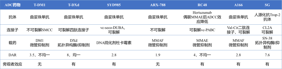 近年来也涌现了许多其他新型的HER2 ADC以及其他靶点ADC。以同样为HER2 ADC类药物的RC48为例,其靶标抗体为Hertuzumab,连接子为可裂解的vc-PABC,载药则是有膜通透性的微管抑制剂MMAE。