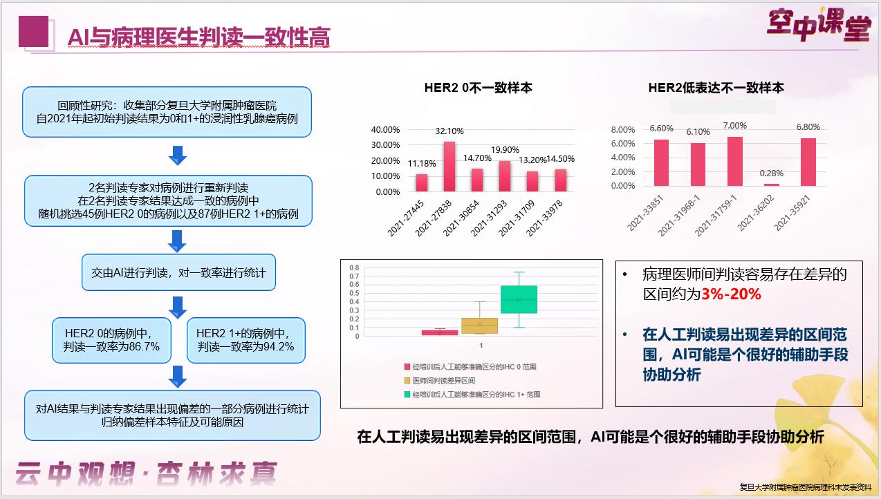 为了验证AI辅助判读的可行性,拓展应用场景,我们进行了一项回顾性研究,纳入本院既往IHC检测0和1+的浸润性乳腺癌病例,首先由2名判读专家重新判读,在专家达成一致的病例中随机挑选45例HER2 0病例以及87例1+病例,交由AI进行判读,并统计一致率。我们发现在HER2 0和1+的病例中,人工与AI的判读一致率分别为86.7%和94.2%。随后对出现偏差的一部分病例进行统计,归纳偏差样本特征及可能原因,发现在人工判读易出现误差的范围内引入AI,可能是很好的辅助分析手段。