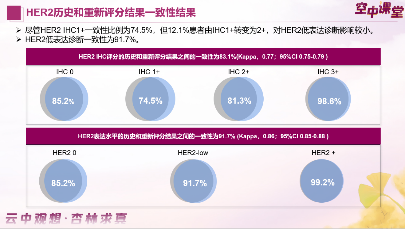 出现历史评分和重新评分间的不一致,主要是因为过去的判读重点在于HER2阳性和阴性的区别,而0和1+的患者在治疗方案上是相同的,未受到足够重视。但对于既往诊断的误差,我们也不用过于担忧。研究表明,病理医生在经过短期的系统培训后,无论是对于HER2 0,还是HER2低表达的判读一致性,都能得到明显的提升[5]
