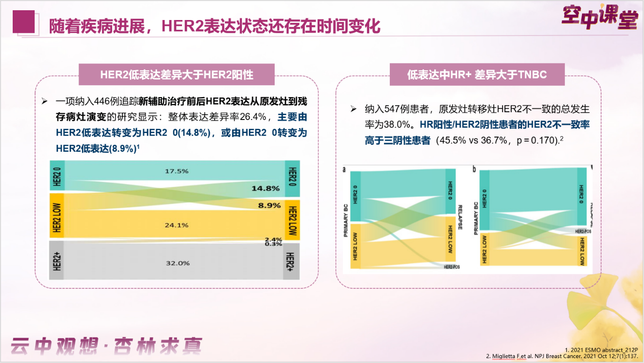 乳腺癌是高度异质性肿瘤,其HER2表达会随着疾病的发展和治疗呈现出时空异质性。以下左图就展示了一项纳入446例接受新辅助治疗乳腺癌患者的研究,对比治疗前后HER2表达状态可知:原发灶与新辅助治疗后残留病灶间整体不一致率为26.4%,主要表现在低表达与HER2 0之间的互相转化。