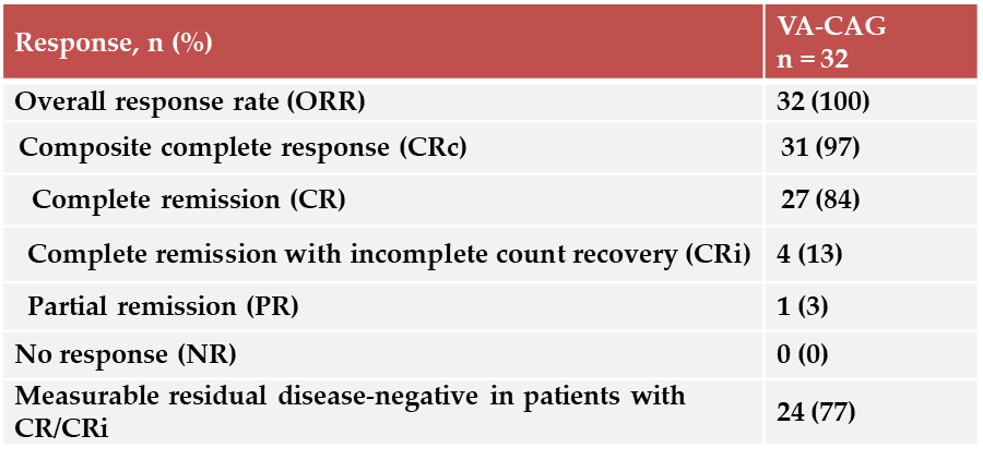 截至2023年9月30日,VA-CAG研究共纳入来自10个中心的32例ND AML患者,患者的中位年龄为49岁(18~63岁)。研究结果显示,总缓解率(ORR)为100%,31例(97%)患者在1个周期后获得复合完全缓解(CRc),1例(3%)患者接受了2个周期治疗后获得部分缓解(PR),MRD阴性率为77%。。中位随访时间为5.7个月(2.0~10.0个月),2例患者复发死亡。未达到中位无白血病生存期(LFS)和中位总生存期(OS)。