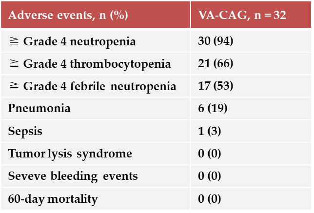 VA-CAG方案在年轻适合强化治疗(fit)的AML患者中获得了较高的CR率和MRD阴性率,安全性良好,感染和输血依赖的发生率较低。
