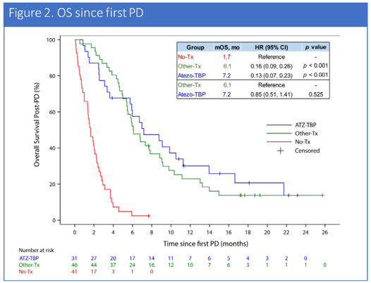 IMfirst是一项在初治ES-SCLC患者中评价卡铂/顺铂+依托泊苷+阿替利珠单抗治疗的Ⅲb期单臂试验。IMfirst研究中ES-SCLC治疗进展(PD)后进行阿替利珠单抗跨线治疗,相较于不接受后续治疗和接受其他治疗,免疫跨线有延长OS趋势,继续ICI治疗未增加不良事件(AE)发生(2023 WCLC. 摘要#P2.14-04)。