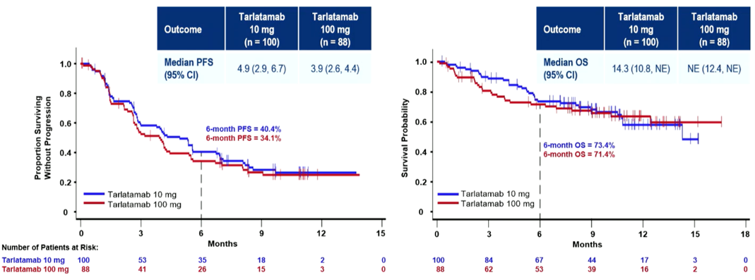 Tarlatamab是一款靶向DLL3的双特异性T细胞结合器(BiTE),DeLLphi-301试验结果显示,Tarlatamab对于既往接受≥2线以上治疗(包括含铂双药)的ES-SCLC患者具有持久的抗肿瘤活性,以10mg剂量给药时可显示出更持久的缓解和更优的抗肿瘤活性,客观缓解率(ORR)达到40%,中位PFS为4.9个月,并表现出良好的安全性,因治疗相关不良事件(TRAEs)导致的停药率较低(2023 ESMO.摘要#LBA92)。