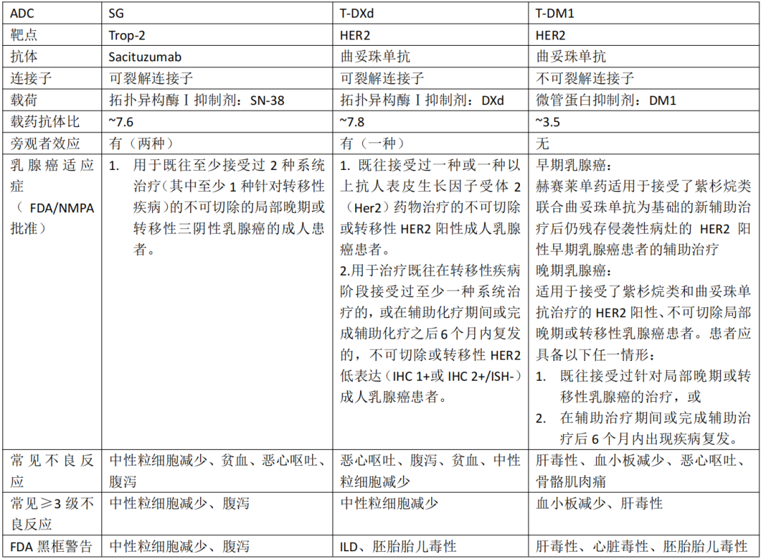 ADC药物的出现使更多靶点得以开发,并有效增加了细胞毒载荷的效力,降低了其毒性,让更多细胞毒药物再次焕发生机。目前在乳腺癌领域有三款已上市ADC药物,包括:2020年4月上市的戈沙妥珠单抗(Sacituzumab govitecan,SG)、2019年12月上市的德曲妥珠单抗(Trastuzumab Deruxtecan,T-DXd)、和2013年2月上市的恩美曲妥珠单抗(Trastuzumab emtansine,T-DM1)。由于靶点及结构设计不同,三者的作用机制、适应症和不良反应谱也不完全一致,临床应用及重点关注的不良反应也有所区别。