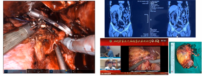 如下图所示,该病例瘤栓充满整个下腔静脉,同时长满血栓,对于该病例我们采用全封闭式的En-block切除,首先是离断下腔静脉,翻起来以后去找寻右肾动脉,切断右肾动脉以后再把左肾静脉切断,然后一直沿着瘤栓向肝后寻找游离肝门后方腔静脉。既往类似病例中肝门后方腔静脉很难暴露清楚,但是有了机器人助力,使其充分显露出来就变的相对容易很多。肝后下腔静脉经过充分游离后,再将瘤栓全部挤压进入腔静脉中,然后探查至无瘤栓处,直线切断腔静脉,将瘤栓取出。完全封闭式的瘤栓取出,可以获得很好的操作空间。该病例曾在2023年4月在第8届泌尿生殖系统研讨会上进行演示。