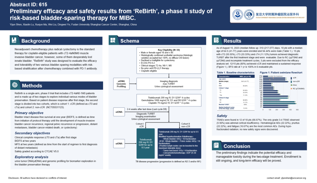保留膀胱的治疗是一种针对肌层浸润性膀胱癌(MIBC)患者的治疗方法,其目的是在不进行膀胱全切的情况下保留膀胱功能。近年,MIBC的保膀胱治疗出现了新的探索方向,特别是融入免疫检查点抑制剂的治疗方案已成为目前的研究热点。本次ASCO GU会议上,复旦大学附属肿瘤医院泌尿外科沈益君教授团队公布的研究显示,替雷利珠单抗联合化疗的分阶段保膀胱策略疗效良好且患者可耐受。