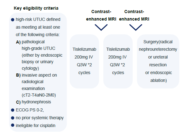该研究纳入人群为高危UTUC患者,研究中对于高危UTUC的定义为通过输尿管镜下活检或尿脱落细胞检查明确为病理高级别尿路上皮癌,或影像学检查示肌层浸润征象,或存在肾积水,同时患者需满足顺铂不耐受标准。入组患者至多接受4个周期新辅助替雷利珠单抗治疗,新辅助治疗期间患者每2个周期治疗完成后需接受影像学检查,包括增强MRI或增强CT检查。在新辅助治疗结束后,患者接受手术治疗,推荐手术治疗方式为根治性肾输尿管切除术联合局部淋巴结清扫,对于肿瘤位于远端输尿管患者可接受输尿管部分切除术,对于新辅助治疗后评估为低危UTUC患者可接受内镜下肿瘤消融手术。研究的主要终点为病理完全缓解率(pCR,定义为ypT0N0),次要终点包括病理缓解率(≤ypT1N0),客观缓解率(ORR),安全性。