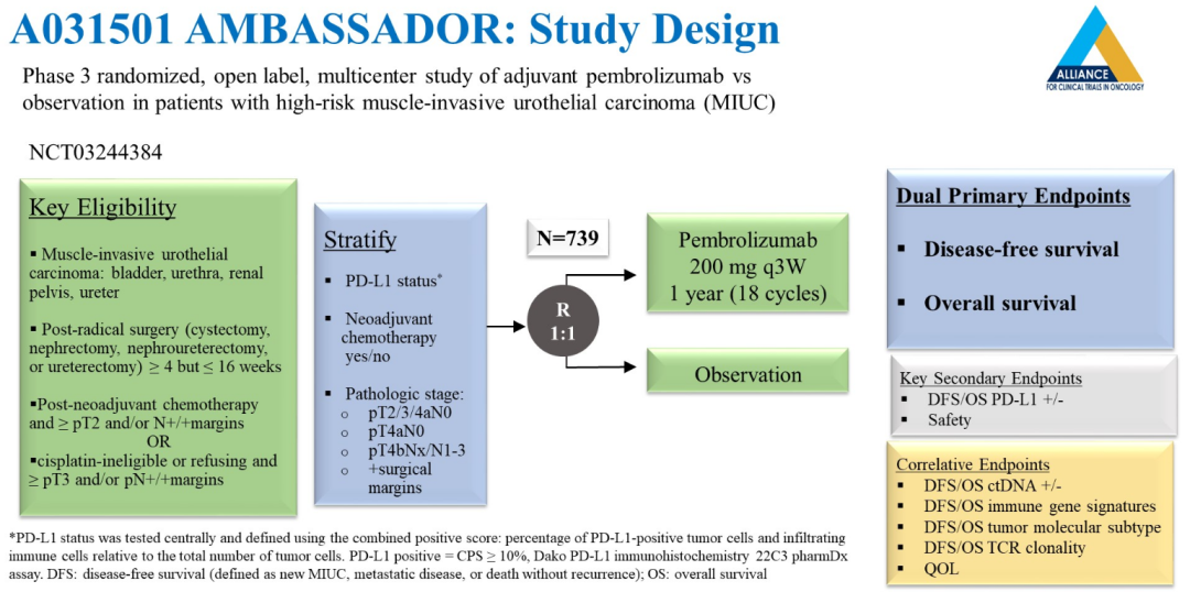 AMBASSADOR Alliance a 031501:帕博利珠单抗辅助治疗对比观察用于肌层浸润性和局部晚期尿路上皮癌(MIUC)的III期研究(摘要号:LBA531)