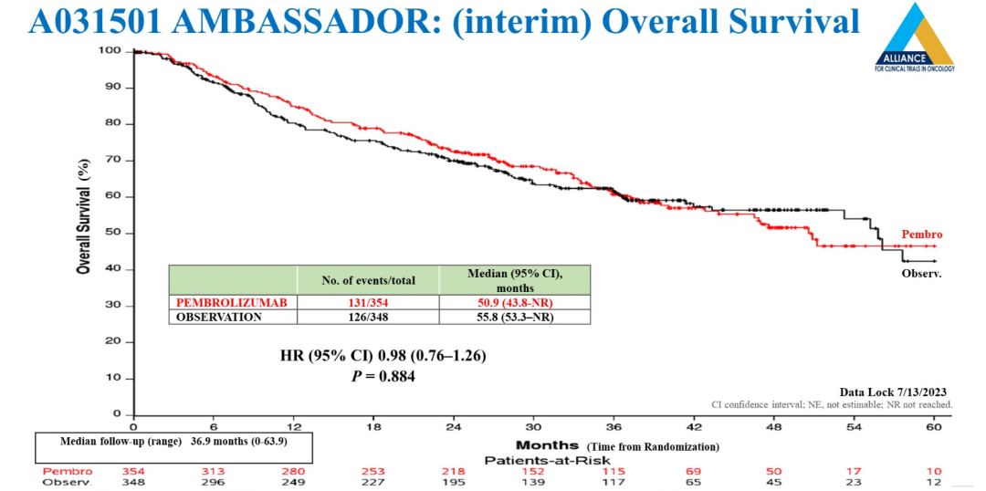 对于根治性手术后的高危MIUC患者,帕博利珠单抗辅助治疗的DFS相较于观察显示出具有统计学意义和临床意义的改善。OS终点可能受到观察组患者使用免疫检查点抑制剂的影响。帕博利珠单抗没有新的安全信号。这些结果支持将帕博利珠单抗辅助治疗作为高复发风险MIUC患者的新治疗选择。最终DFS/OS、PD-L1亚组和ctDNA分析的其他随访正在进行中。