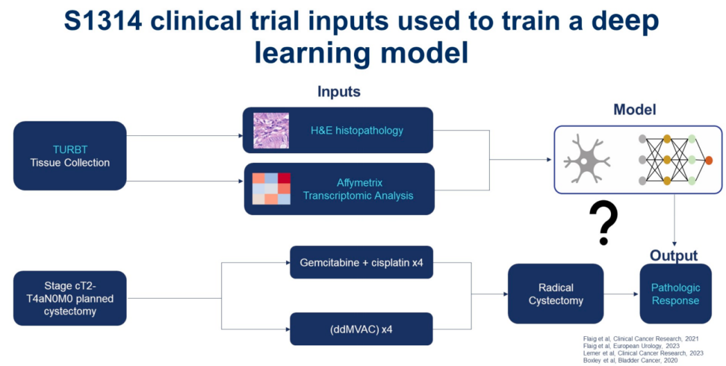 新辅助化疗是MIBC患者行根治性膀胱切除术前的标准治疗方案,但并非所有患者均能从新辅助化疗中获益。对于MIBC患者接受新辅助化疗的疗效预测,将为我们的临床治疗选择提供重要参考。在2019年ASCO会议中,S1314研究报道了利用COXEN评分预测MIBC新辅助化疗疗效的相关结果。本次ASCO GU会议中,报道了一项利用多模态深度学习模型预测S1314-COXEN研究临床结局的研究结果。这项多模态深度学习模型整合了组织病理图像、细胞类型和基因表达等信息。