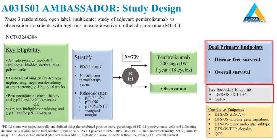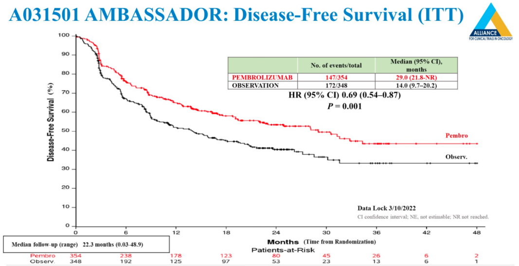 含铂方案(尤其是顺铂)新辅助化疗对于肌层浸润性尿路上皮癌具有重要作用。但是相当一部分患者无法耐受顺铂方案化疗,或新辅助化疗后仍有残留肌层浸润性肿瘤。在既往的CheckMate-274及IMvigor-010研究中,分别探讨了纳武利尤单抗及阿替利珠单抗等免疫检查点抑制剂在术后辅助治疗中的疗效,但研究结论却不尽相同。此项AMBASSADOR研究探索了帕博利珠单抗在肌层浸润性尿路上皮癌术后辅助治疗中的应用情况,患者入组标准与CheckMate-274相同,选择了新辅助化疗后残留≥pT2/N+/切缘阳性的患者,或未接受新辅助化疗且≥pT3/N+/切缘阳性的患者。试验组接受帕博利珠单抗200 mg,每三周给药一次,持续一年的治疗方案。对照组为单纯观察组。