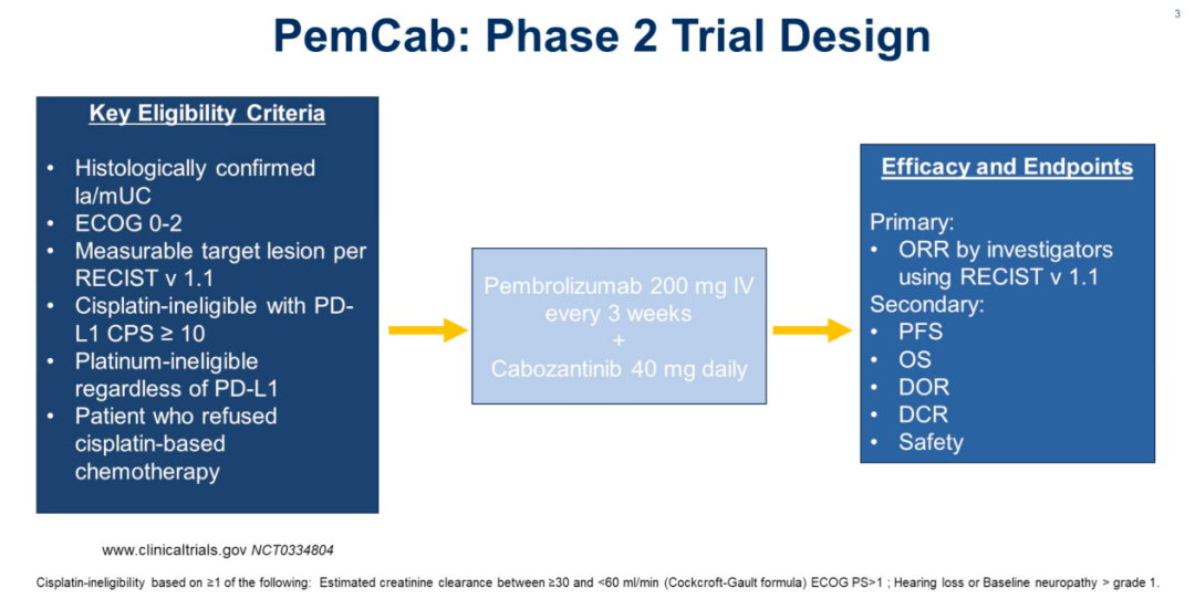 随着免疫检查点抑制剂和抗体偶联药物时代的到来,传统的晚期尿路上皮癌一线治疗领域屡受挑战。在去年ESMO会议EV-302研究大放光彩的背景下,本次会议又报道了一项新的晚期尿路上皮癌一线治疗方案探索。PemCab研究选择了在多种恶性肿瘤中获得成功的多靶点酪氨酸酶抑制剂卡博替尼,联合帕博利珠单抗治疗。此研究是一项二期多中心单臂临床研究,入选标准包括未经治疗的局部晚期或转移性尿路上皮癌患者、ECOG 0-2分、顺铂不耐受或拒绝顺铂化疗。