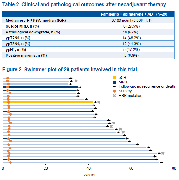 本研究为一项单中心、开放标签、单臂的II期临床研究,该研究纳入了未经治疗的前列腺癌患者,所有患者均至少有一项危险因素(分期≥T3a,Gleason评分≥8或PSA≥20 ng/ml),患者接受帕米帕利40 mg每日两次口服,阿比特龙1000 mg每日一次口服,泼尼松5 mg每日两次口服,以及ADT治疗,总计4个月的新辅助治疗,随后进行RP(根治性前列腺切除术)。主要研究终点是病理完全缓解(pCR)或微小残留病灶(MRD)的发生率。MRD定义为肿瘤≤0.5 cm或残余癌负荷(RCB)≤0.25 cm3。次要研究终点包括PSA反应、病理降期率、手术切缘阳性率、术后12个月PSA复发率及安全性。