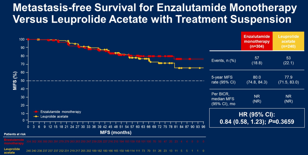 EMBARK是一项针对高危BCR患者(即PSA倍增时间(PSADT)≤9个月,且放疗后PSA≥2 ng/mL或根治性前列腺切除术±放疗后≥1 ng/mL)的双盲3期研究。患者随机(1:1)接受恩扎卢胺单药(160 mg/天,开放标签)或亮丙瑞林单药(每12周22.5 mg)。第36周PSA<0.2 ng/mL时则第37周暂停治疗;对于存在或不存在原发性RP患者,当PSA分别≥2 ng/mL或≥5 ng/mL时,治疗重新启动。次要终点是暂停治疗2年后未检出PSA的患者比例。根据暂停状态对每个治疗组的MFS(通过盲法独立中心审查)进行描述性分析。P值为名义值。