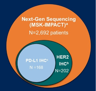 本次ASCO-GU中的一项研究利用纪念斯隆·凯特琳癌症研究中心的MSK-IMPACT平台[4],回顾性地纳入了具有HER2测序数据及HER2免疫组化结果的202例患者,其中168例还具有PD-L1免疫组化结果(图1)。研究发现在HER2基因突变或扩增的比例为22.3%,HER2免疫组化评分为0、1+、2+和3+的比例分别为18.8%、29.7%、33.7%和17.8%(图2);而PD-L1表达CPS评分≥10的比例为48.2%。
