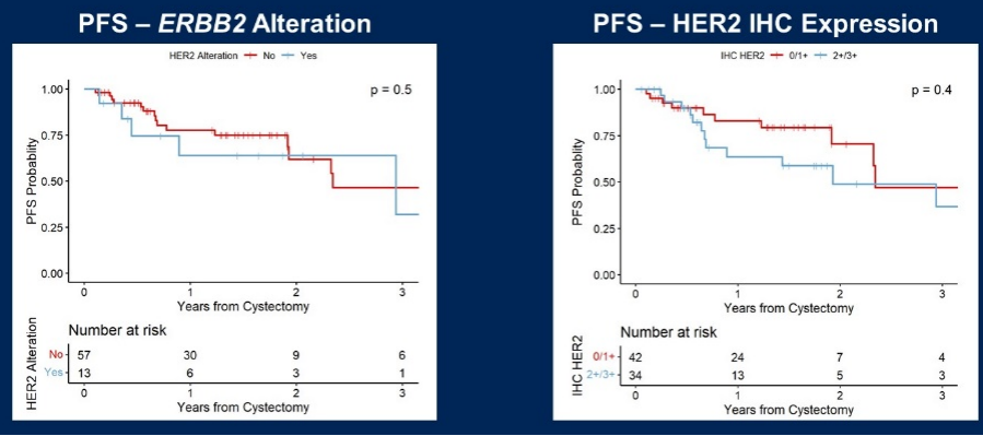 研究另外还发现肌层浸润性膀胱癌(MIBC)患者,不论是具有HER2基因是否突变及扩增,以及HER2免疫组化是否过表达(2+和3+vs.1+和0),其无进展生存时间(PFS)并无显著性差异(图3)。所以研究者提出,单纯通过HER2的二代测序,也是无法筛选出哪些患者更能从HER2靶向治疗中获益。同时在决定进展期的尿路上皮癌患者是否采用HER2靶向治疗时,或许可以弱化其肿瘤组织中HER2免疫组化表达情况。不过,此研究纳入的人群并未详细阐述其临床治疗方式,所以不能轻易得出HER2免疫组化评分与尿路上皮癌患者接受HER2靶向治疗有效性无关的结论。