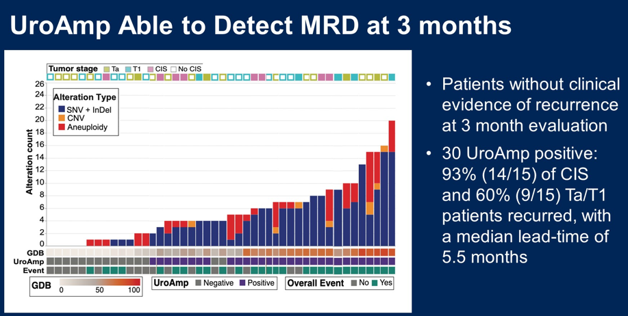Dr.Marie-Pier St-Laurent:Our study,derived from SWOG 1605,investigated urine tumor DNA(utDNA),aiming to determine if this test could predict recurrence in patients treated with atezolizumab for BCG-unresponsive NMIBC.Our findings revealed that patients testing positive for utDNA at baseline were almost three times more likely to experience recurrence within 12 and 18 months compared to those testing negative.Interestingly,this test helped identify minimal residual disease(MRD)in patients showing no disease via cystoscopy and cytology but having high tumor mutations in their urine.This could guide further investigations,such as bladder biopsies,to detect recurrences not identified by current standard methods.