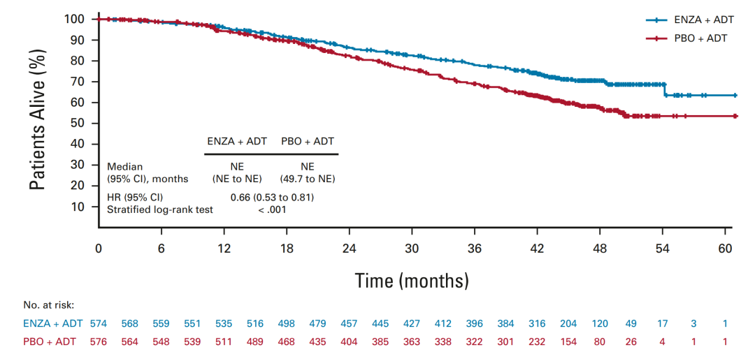 此前2023年AUA大会及NEJM报道该研究达到了主要终点:恩扎卢胺+ADT组相较于ADT组的5年MFS率提高了15.9%(87.3%vs 71.4%),转移疾病风险显著降低58%(HR 0.42,P<0.0001)。在关于单药组的次要终点方面,也显示恩扎卢胺单药组相较于ADT组的转移疾病风险降低37%(MFS:NR vs NR;HR 0.63,P=0.049)