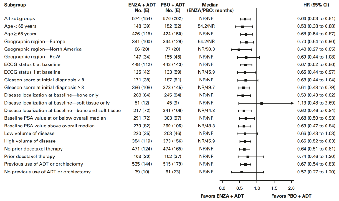 第二,恩扎卢胺的获益人群广泛。从亚组分析来看,包括低瘤负荷或高瘤负荷,既往是否接受过化疗,年轻(<65岁)或老年(≥65岁)等不同亚组患者均可获益。目前国内指南主要根据肿瘤负荷进行mHSPC治疗方案的推荐,恩扎卢胺是可以覆盖低瘤负荷、高瘤负荷的NHT方案。