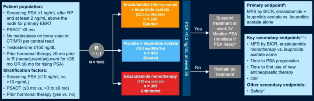 徐涛教授:EMBARK研究是一项全球多中心3期研究,入组患者为根治术后PSA≥1ng/mL或首次EBRT放疗后PSA最低值>2ng/mL,PSA倍增时间(PSADT)≤9个月的患者,随机(1:1:1)分为3个治疗组:恩扎卢胺+ADT组,ADT组,恩扎卢胺组。主要终点是盲法独立中心评估(BICR)恩扎卢胺+ADT对比ADT的无转移生存期(MFS),次要终点包括BICR评估恩扎卢胺对比ADT的MFS,至PSA进展时间,至首次使用新抗肿瘤时间,OS和安全性等。