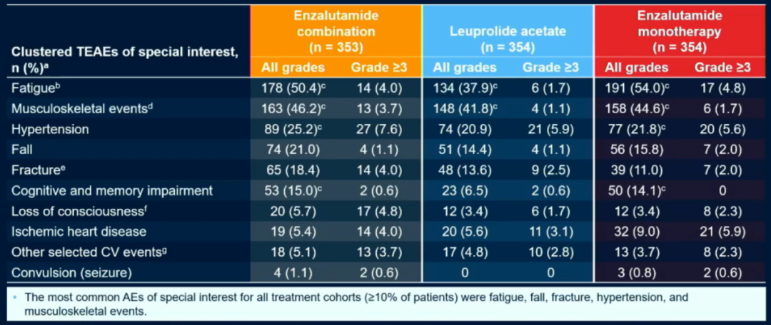 在安全性方面,恩扎卢胺的不良事件与既往报道相似,常见的不良事件是乏力、肌肉骨骼时间、高血压、跌倒、骨折等,整体上恩扎卢胺联合组与单药组、ADT组的这些事件发生率相差不大,例如三组患者≥3级的乏力发生率分别为4.0%、1.7%和4.8%,肌肉骨骼不良事件分别为3.7%、1.1%和1.7%,高血压分别为7.6%、5.9%和5.6%。