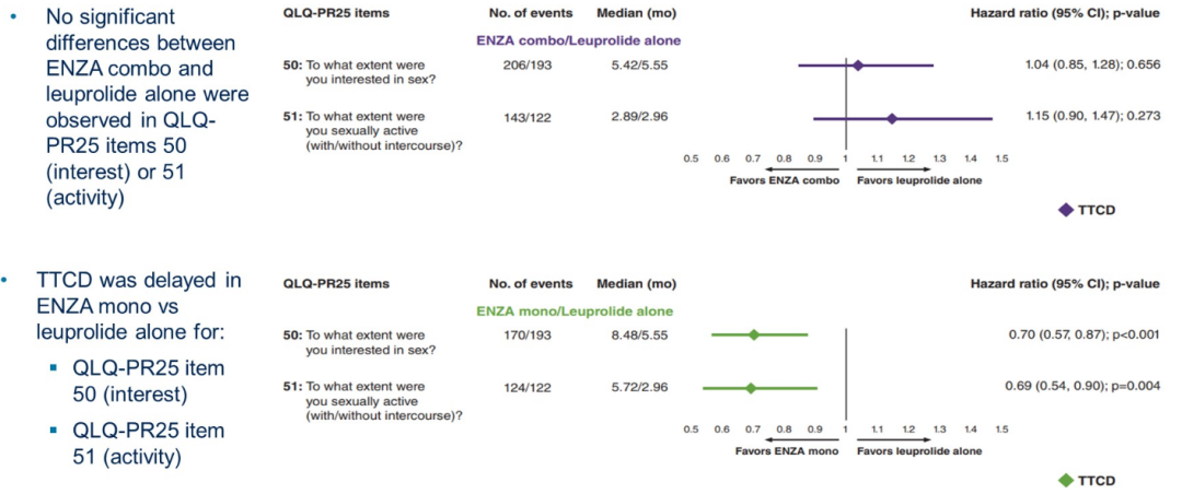另一项壁报则报道了EMBARK研究的PRO分析,结果提示恩扎卢胺单药对比单独ADT在兴趣、行动、满意度和维持勃起方面改善性活动;而恩扎卢胺联合方案对比单独ADT,没有增加性活动负担。