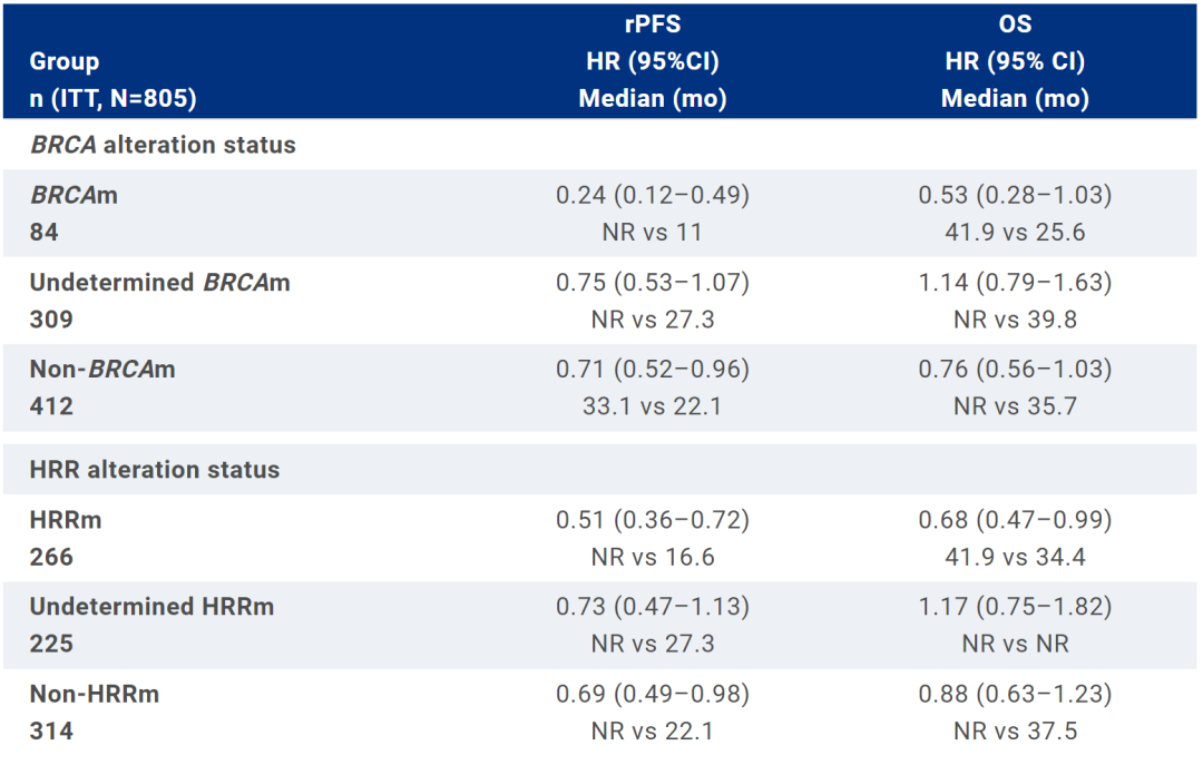 如前所述,TALAPRO-2研究全人群(all comer)已获得rPFS阳性结果,但这一阳性结果是否主要由BRCAm/HRRm驱动所致?该研究的一项事后分析显示:全人群的rFPS获益可能主要由BRCAm/HRRm阳性患者所贡献,而未检测到BRCAm/HRRm(包括BRCAm/HRRm阴性或状态不明确)的患者尽管也有rPFS获益,但获益幅度相较BRCAm/HRRm阳性患者更小。OS数据尚未成熟,但已经可以看到BRCAm/HRRm亚组患者的显著获益趋势。