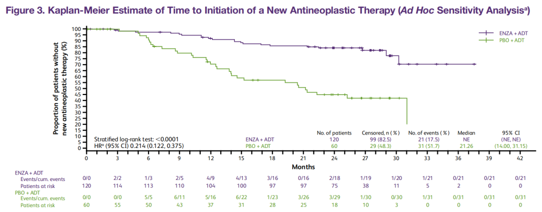研究结果显示达到了主要终点:恩扎卢胺组的PSA进展风险显著降低87%(TTPP:HR 0.130,P<0.0001)。在次要终点方面:恩扎卢胺组的影像学疾病进展风险降低67%(rPFS:NR vs 19.4个月,HR 0.330,P<0.001),去势抵抗风险降低82.8%(TTCR:NR vs 8.3个月,HR 0.172,P<0.001),PSA降低至不可检测水平的比例高达76.3%,较对照组的22.8%显著提高53.5%。该研究中对照组有23例患者交叉至恩扎卢胺组,如果考虑此类揭盲事件的话,恩扎卢胺组的至首次新抗肿瘤治疗风险则显著降低78.5%(HR 0.214)。