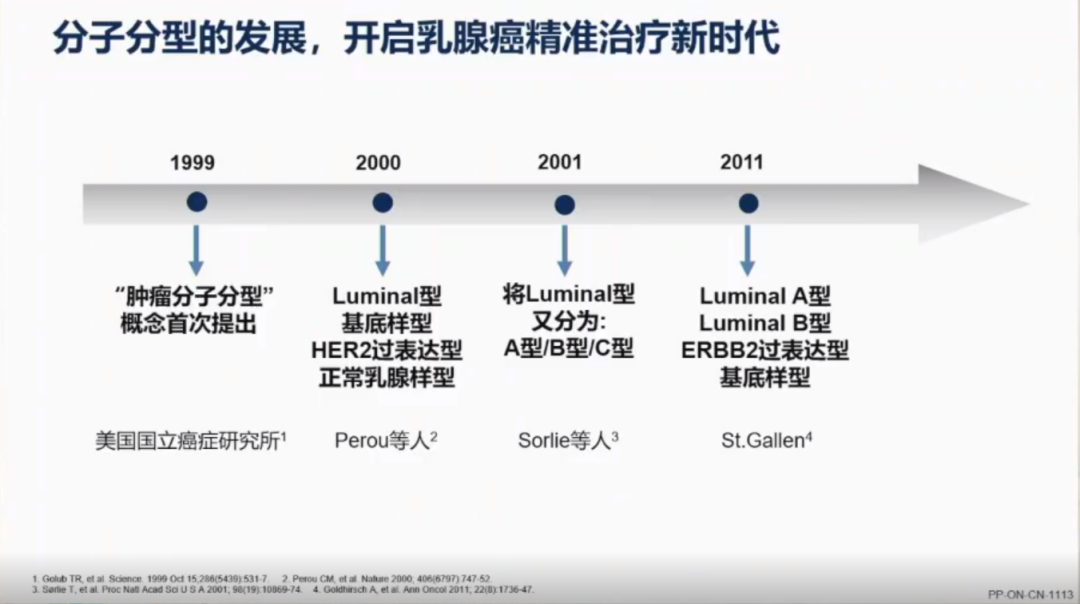 1999年,“肿瘤分子分型”概念首次提出。随后,美国知名的生物学者Charles M.Perou根据乳腺癌的表达谱进一步进行“分子分型”,分子分型的发展开启了乳腺癌精准治疗新时代。