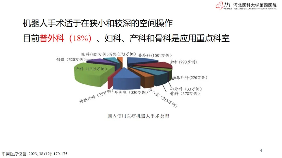 机器人手术系统主要是指机器人腔镜手术系统。与传统腔镜手术相比,机器人手术系统展现出一些显著的优势,包括放大数倍的高清3D立体成像、机械臂有7方向活动自由度以及远程操作能力。基于这些特性,最新文献表明[1],机器人手术更适于在狭小和较深的空间操作,目前普外科(18%)、妇科、产科和骨科是应用重点科室。