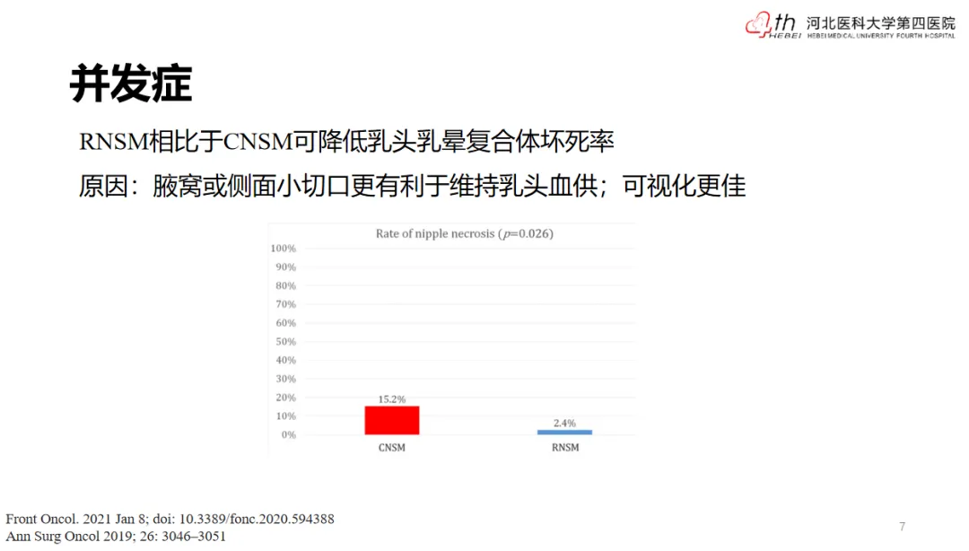 在并发症方面,既往研究数据表明[2,3],机器人辅助保留乳头乳晕的乳房切除术(RNSM)相较于传统保留乳头乳房切除术(CNSM)可降低乳头乳晕复合体坏死率。究其原因主要有两个,RNSM腋窝或侧面小切口更有利于维持乳头血供,提供了更佳的可视化效果。尽管如此,也有相关研究数据报道[4-7],RNSM相比CNSM乳头乳晕复合体(NAC)坏死率较低,但差异无统计学意义。在围手术期并发症类型和发生率方面,RNSM和CNSM无显著统计学差异。