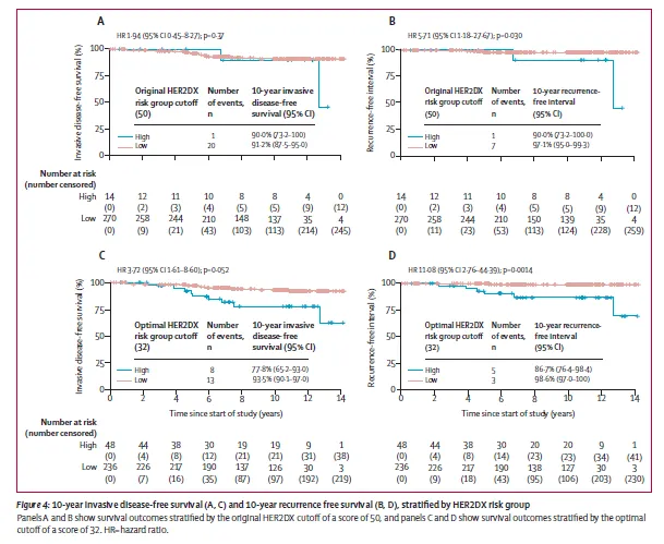 图6按HER2DX风险组分层的10年无浸润性疾病生存期(A,C)和10年无复发生存期(B,D)