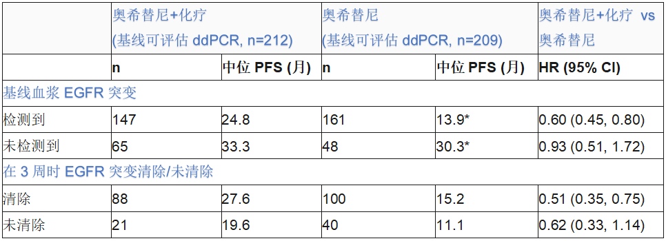 在接受奥希替尼+化疗或奥希替尼单药治疗的患者中,基线时血浆中ctDNA未检测到EGFR突变(n=113)相比检测到EGFR突变患者(n=308)的中位PFS更长,分别为30.5个月(95%CI:25.0-不可计算[NC])和18.3个月(95%CI:15.4-21.0)(HR=0.55;95%CI:0.42~0.73)。