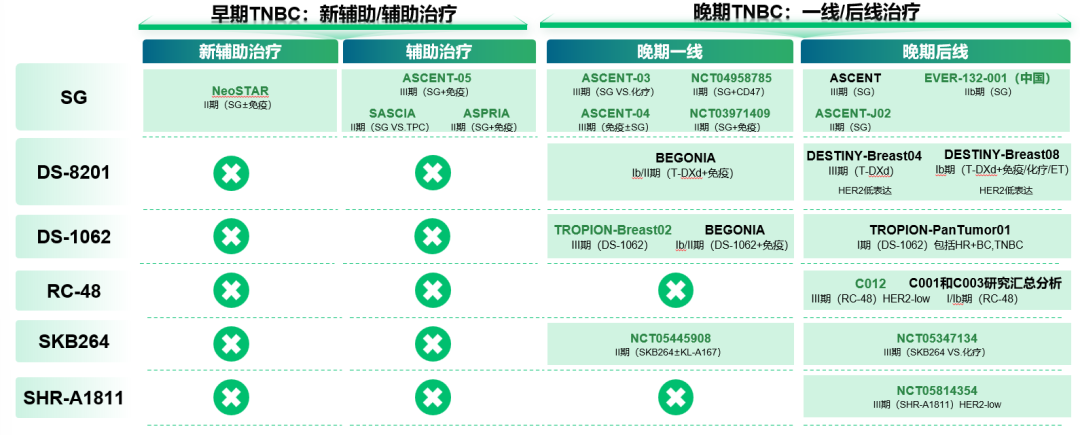 乳腺癌是女性最常见的恶性肿瘤之一。国家癌症中心最新统计数据显示,中国年新发乳腺癌病例35.72万,居女性新发恶性肿瘤第二位[1]。TNBC约占乳腺癌的15-20%[2],是预后最差的亚型[3]。晚期TNBC患者5年生存率仅12.2%[4],是其5年生存率最低的疾病阶段[5]。随着临床对TNBC的认识加深,靶向、免疫、ADC的不断发展,晚期TNBC的治疗从化疗时代走过靶向免疫时代,正式进入ADC时代,其治疗策略逐渐实现现代化。
