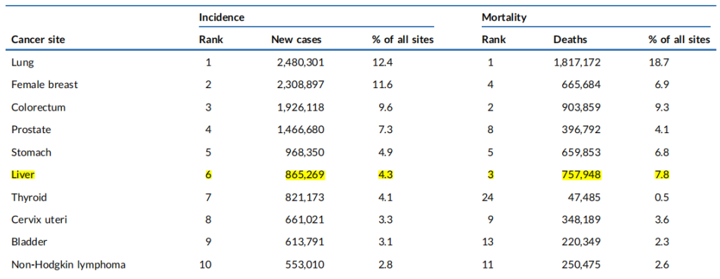 最新公布的全球癌症统计数据显示,2022年,全球有超过75万人死于肝癌,使肝癌成为仅次于肺癌和结直肠癌的第三大癌症死亡原因,也是第六大常见诊断癌症,估计2022年有86.5万新发病例和75.8万死亡病例[1]。
