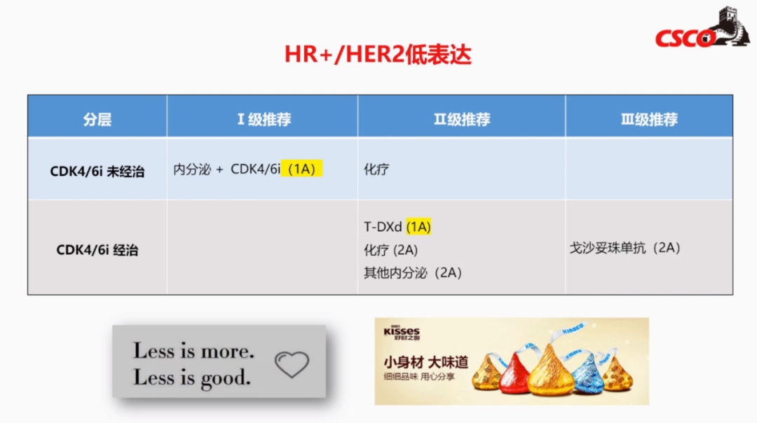 对于HR+/HER2低表达人群,我们在进行治疗选择时一定要强调内分泌治疗的标准地位。如果是内分泌治疗失败的人群,特别是内分泌+CDK4/6抑制剂治疗进展且存在HER2低表达的患者,我们要优先考虑ADC药物(T-DXd)进行治疗。但如果患者为HR+/HER2低表达人群,却未进行内分泌治疗,还应优先考虑内分泌治疗的路径推荐,推荐方案可以参照CSCO BC指南中HR+/HER2-乳腺癌患者的治疗。