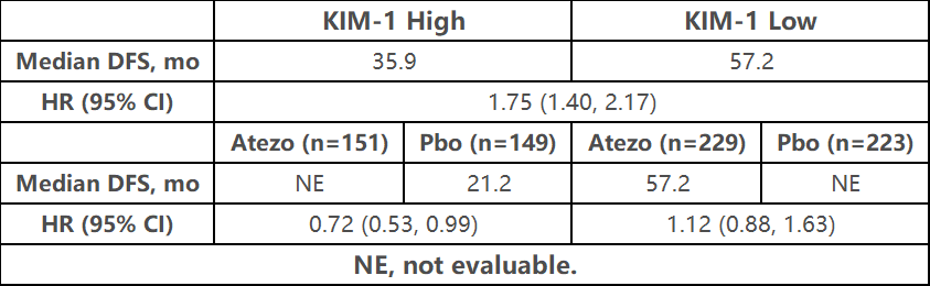 患透明细胞肾细胞癌或肉瘤样肾细胞癌且肾切除术后复发风险较高的患者随机(比例为1:1)接受阿替利珠单抗1200 mg或安慰剂,每3周一次,16个周期或1年。使用包含约3000种分析物的临床延伸分析技术(PEA)进行回顾性蛋白质组学分析。然后使用高灵敏电化学发光技术(ECL)来评估基线和治疗后血清样本中的KIM-1水平,KIM-1是一种在透明细胞肾细胞癌和乳头状肾细胞癌中过表达的膜糖蛋白。分析了基线时KIM-1高水平(≥86 pg/mL)与低水平患者的结局。