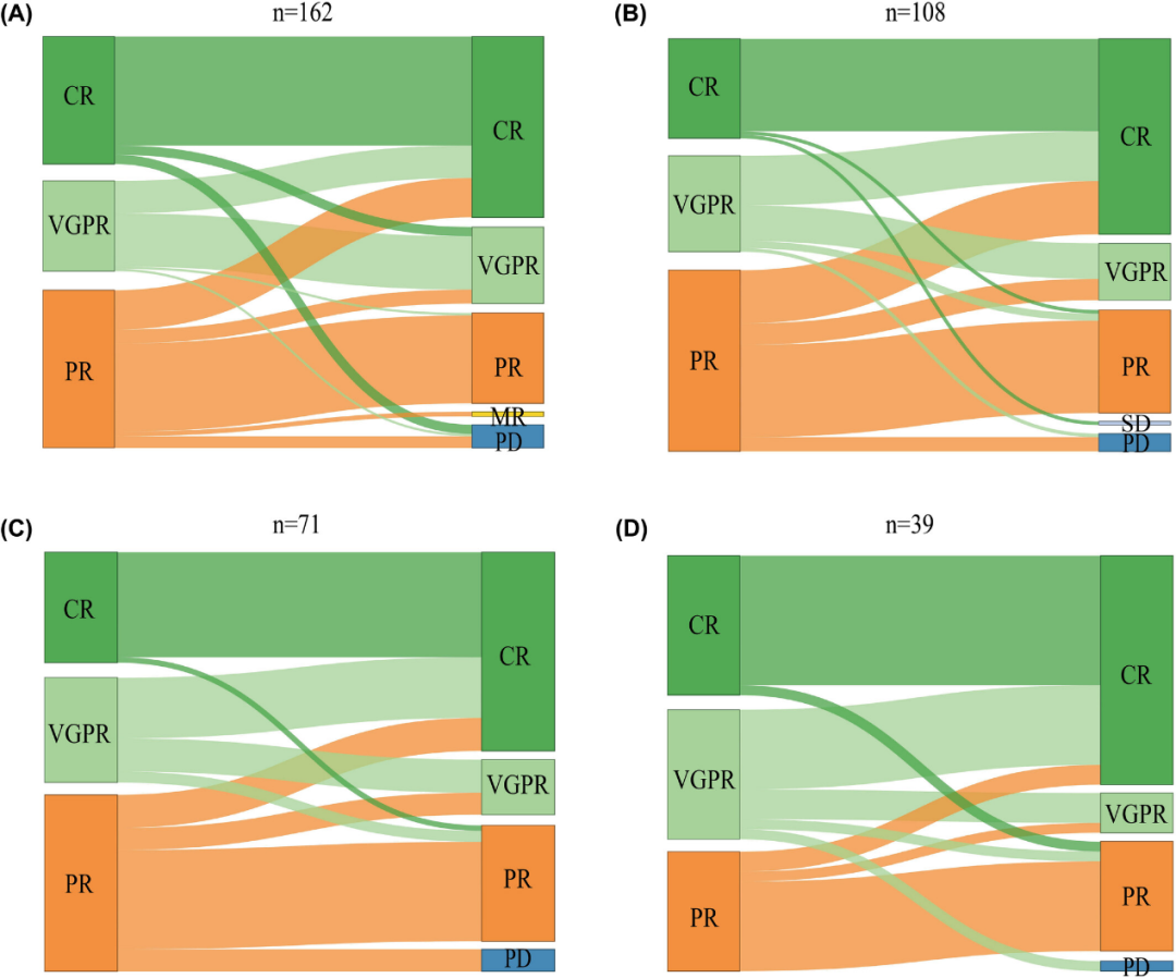 转换为伊沙佐米方案后,标准风险队列的sCR和CR率分别上升至18%和43%,VGPR和PR率分别下降至14%和21%;高风险队列的sCR和CR率分别上升至17%和20%,VGPR和PR率分别下降至26%和19%。至于未知风险队列,转换为伊沙佐米治疗后,sCR率从12%增加到23%,CR率从21%增加到39%,PR率从50%下降到22%(图2)。